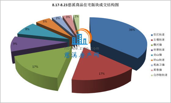 慈溪商品住宅(含别墅)各版块成交情况中,城区版块(浒山街道、古塘街道、白沙路街道、宗汉街道、坎墩街道)共成交68套,成交均价8891.71元/㎡。排名前三版块:宗汉街道备案36套,占36%;古塘街道与横河镇各备案16套,各占17%;坎墩街道备案9套,占9%。