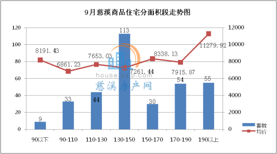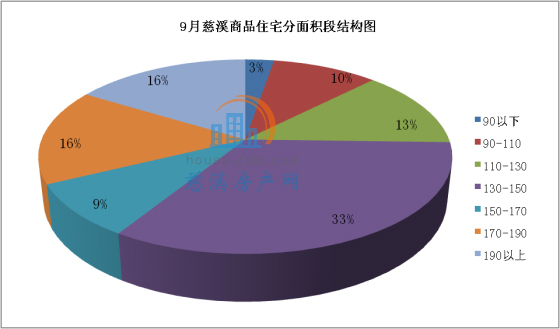 9月慈溪商品住宅分面积段成交中,130-150㎡面积段产品成交113套,成交均价7261.44元/㎡,占总成交套数的33%,销量排名第一;190㎡以上面积段产品成交55套,成交均价11279.92元/㎡,占总成交套数的16%,销量排名第二;170-190㎡面积段产品成交54套,成交均价7915.87元/㎡,占总成交套数的16%,销量排名第三。