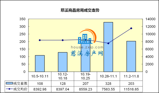 上周(11.2-11.8)成交各类房源(含住宅、公寓、商铺、写字楼和车库)共计203套,成交均价11516.65元/㎡,成交面积22979.94方。环比上上周成交量下降38.11%,成交均价上升52.27%,成交面积下降32.45%。
