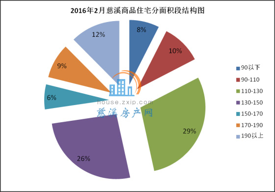 2月慈溪商品住宅分面积段成交中,110-130㎡面积段产品成交47套,成交均价7232.49元/㎡,占总成交套数的29%,销量排名第一;130-150㎡面积段产品成交42套,成交均价7936.39元/㎡,占总成交套数的26%,销量排名第二;190㎡以上面积段产品成交20套,成交均价10490.02元/㎡,占总成交套数的12%,销量排名第三。