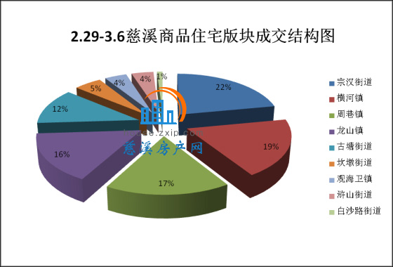 慈溪商品住宅(含别墅)各版块成交情况中,城区版块(浒山街道、古塘街道、白沙路街道、宗汉街道、坎墩街道)共成交44套,成交均价9143.28元/㎡。排名前三版块:宗汉街道备案22套,占上周商品住宅成交总量22%;横河镇备案19套,占上周商品住宅成交总量的19%;周巷镇备案17套,占上周商品住宅成交总量17%。