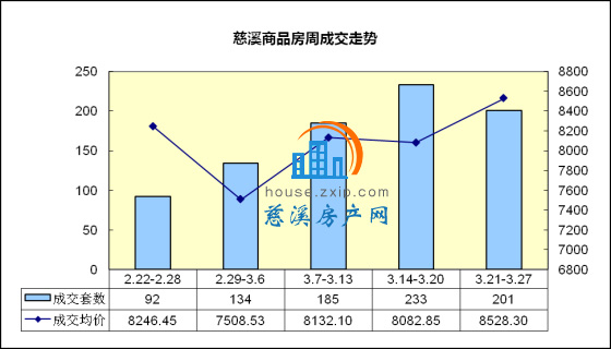 上周(3.21-3.27)成交各类房源(含住宅、公寓、商铺、写字楼和车库)共计201套,成交均价8528.3元/㎡,成交面积23622.52方。环比上上周成交量下降13.73%,成交均价上升5.51%,成交面下降3.07%。