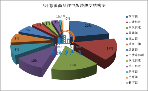 3月慈溪商品住宅版块成交中,城区楼盘(浒山街道、古塘街道、白沙路街道、坎墩街道、宗汉街道)成交251套,成交均价10008.13元/㎡。横河镇成交备案126套,占当月全市总成交量22%;古塘街道成交备案99套,占当月全市总成交量17%;宗汉街道成交备案90套,占当月全市总成交量16%。