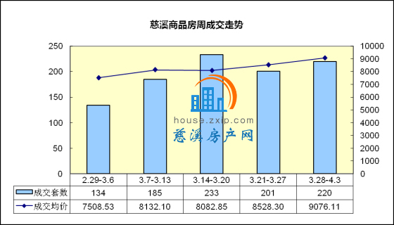 上周(3.28-4.3)成交各类房源(含住宅、公寓、商铺、写字楼和车库)共计220套,成交均价9076.11元/㎡,成交面积21918.12方。环比上上周成交量上升9.45%,成交均价上升6.42%,成交面下降7.22%。