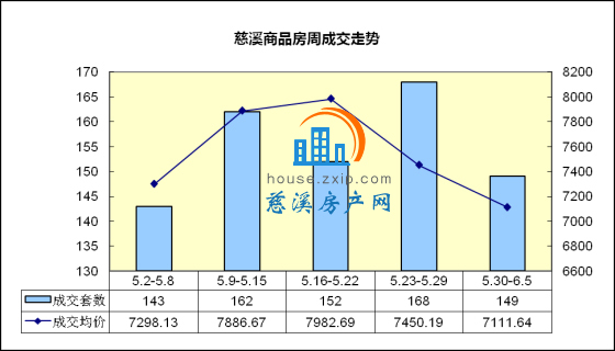 上周(5.30-6.5)成交各类房源(含住宅、公寓、商铺、写字楼和车库)共计149套,成交均价7111.64元/㎡,成交面积16335方。环比上上周成交量下降11.31%,成交均价下降4.54%,成交面积下降6.23%。