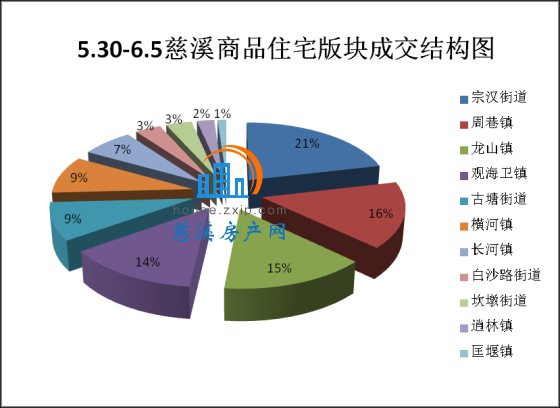慈溪商品住宅(含别墅)各版块成交情况中,城区版块(浒山街道、古塘街道、白沙路街道、宗汉街道、坎墩街道)共成交33套,成交均价9225.83元/㎡。排名前三版块:宗汉街道备案19套,占上周商品住宅成交总量21%;周巷镇备案14套,占上周商品住宅成交总量的16%;龙山镇备案13套,占上周商品住宅成交总量15%。