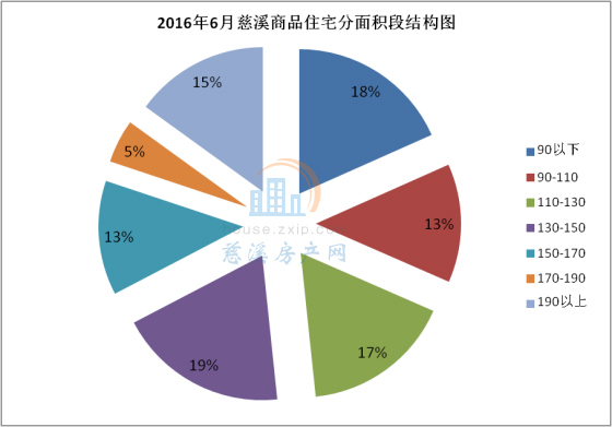 6月慈溪商品住宅按面积段成交中,130-150㎡面积段产品成交86套,成交均价7656.38元/㎡,占总成交套数的19%,销量排名第一;90㎡以下面积段产品成交83套,成交均价4745.62元/㎡,占总成交套数的18%,销量排名第二;110-130㎡面积段产品成交76套,成交均价7106.81元/㎡,占总成交套数的17%,销量排名第三。