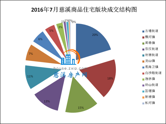 7月慈溪商品住宅版块成交中,城区楼盘(浒山街道、古塘街道、白沙路街道、坎墩街道、宗汉街道)成交155套,成交均价9426.36元/㎡。古塘街道成交备案64套,占当月全市总成交量20%;横河镇成交备案57套,占当月全市总成交量18%;周巷镇成交备案47套,占当月全市总成交量15%。