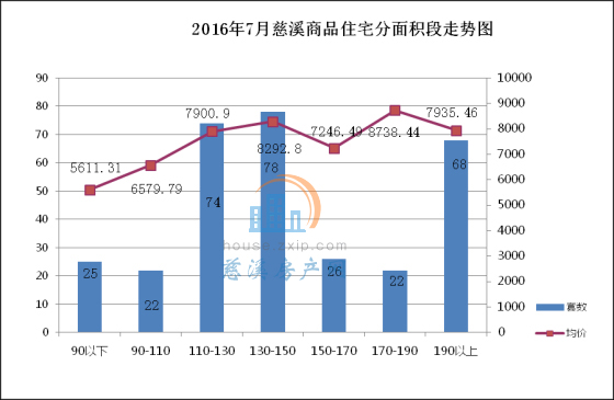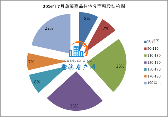 7月慈溪商品住宅按面积段成交中,130-150㎡面积段产品成交78套,成交均价8292.8元/㎡,占总成交套数的25%,销量排名第一;110-130㎡面积段产品成交74套,成交均价7900.9元/㎡,占总成交套数的23%,销量排名第二;190㎡以上面积段产品成交68套,成交均价7935.46元/㎡,占总成交套数的22%,销量排名第三。