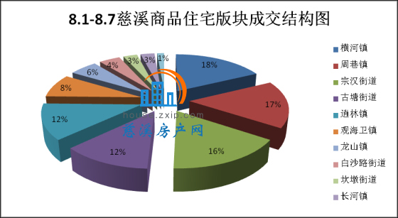 慈溪商品住宅(含别墅)各版块成交情况中,城区版块(浒山街道、古塘街道、白沙路街道、宗汉街道、坎墩街道)共成交27套,成交均价9642.06元/㎡。排名前三版块:横河镇备案13套,占上周商品住宅成交总量的18%;周巷镇和宗汉街道备案12套,占上周商品住宅成交总量的17%;古塘街道和逍林镇备案9套,占上周商品住宅成交总量的12%。