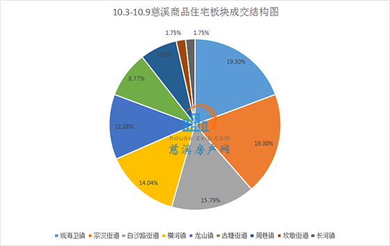 慈溪商品住宅(含别墅)各版块成交情况中,城区版块(浒山街道、古塘街道、白沙路街道、宗汉街道、坎墩街道)共成交26套,成交均价8873.18元/㎡。排名前三版块:观海卫镇和宗汉街道各备案11套,占上周商品住宅成交总量的19.30%;白沙路街道备案9套,占上周商品住宅成交总量的15.79%;横河镇备案8套,占上周商品住宅成交总量的14.04%。