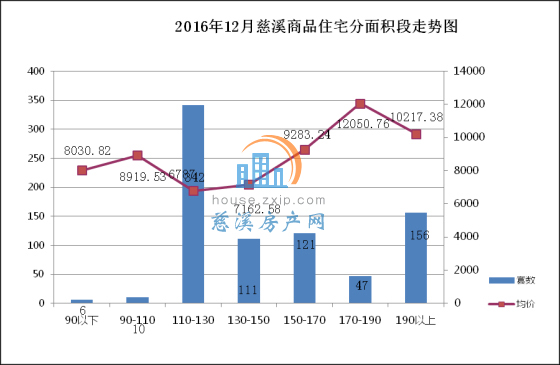 12月慈溪商品住宅按面积段成交中,110-130㎡面积段产品成交342套,成交均价6787元/㎡,占总成交套数的43%,销量排名第一;190㎡以上面积段产品成交156套,成交均价10217.38元/㎡,占总成交套数的20%,销量排名第二;150-170㎡以上面积段产品成交121套,成交均价9283.24元/㎡,占总成交套数的15%,销量排名第三。