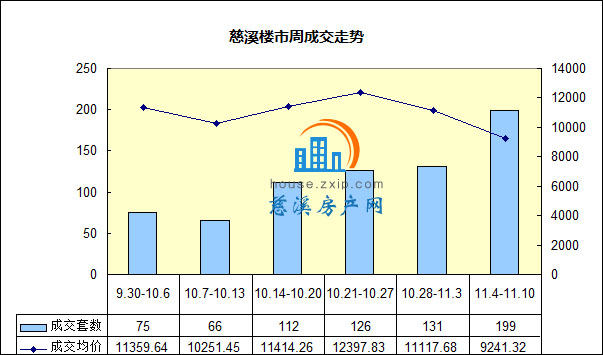 慈溪上周(11.4-11.10)成交各类房源(含住宅、公寓、商铺、写字楼和车库)共计199套(包含人才公寓星光家园41套),成交均价9241.32元/。环比上上周成交量提升51.91%,成交均价下降16.88%。