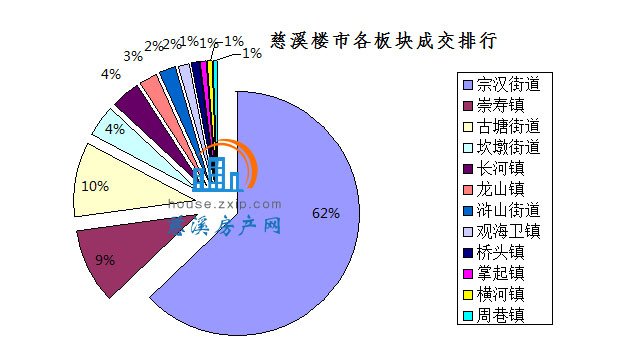 慈溪各板块各类房源成交情况中,宗汉街道上周凭借两大主力热销楼盘瑞宝尚元与星光家园总成交125套,占据62%;古塘街道与崇寿镇各成交备案20套。