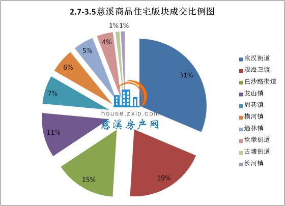 慈溪商品住宅(含别墅)各版块成交情况中,城区版块(浒山街道、古塘街道、白沙路街道、宗汉街道、坎墩街道)共成交52套,成交均价10811.33元/㎡。排名前三版块:宗汉街道备案32套,占上周商品住宅成交总量的31%;观海卫镇备案20套,占上周商品住宅成交总量的19%;白沙路街道备案15套,占上周商品住宅成交总量的15%。