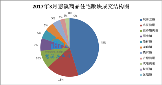 3月慈溪商品住宅版块成交中,城区楼盘(浒山街道、古塘街道、白沙路街道、坎墩街道、宗汉街道)成交246套,成交均价10629.07元/㎡。在3月慈溪商品住宅版块成交排行榜中,观海卫镇成交备案336套,占当月全市总成交量45%,排名第一;宗汉街道成交备案135套,占当月全市总成交量18%,排名第二;白沙路街道成交备案74套,占当月全市总成交量10%,排名第三。