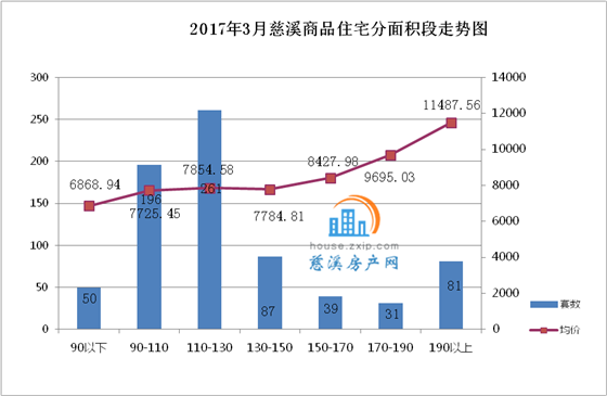 3月慈溪商品住宅按面积段成交中,110-130㎡面积段产品成交261套,成交均价7854.58元/㎡,占总成交套数的35%,销量排名第一。90-110㎡面积段产品成交196套,成交均价7725.45元/㎡,占总成交套数的26%,销量排名第二;130-150㎡面积段产品成交87套,成交均价7784.81元/㎡,占总成交套数的12%,销量排名第三。
