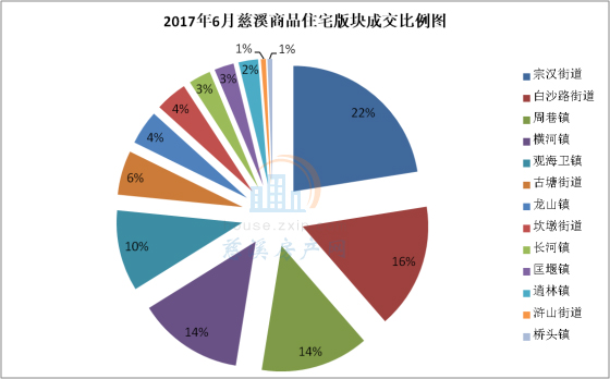 6月慈溪商品住宅版块成交中,城区楼盘(浒山街道、古塘街道、白沙路街道、坎墩街道、宗汉街道)成交155套,成交均价11020.75元/㎡。宗汉街道成交备案71套,占当月全市总成交量22%;白沙路街道成交备案51套,占当月全市总成交量16%;周巷镇成交备案44套,占当月全市总成交量14%。