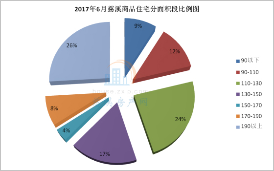6月慈溪商品住宅按面积段成交中,190㎡以上面积段产品成交82套,占总成交套数的26%,销量排名第一;110㎡-130㎡面积段产品成交75套,占总成交套数的24%,销量排名第二;130-150㎡面积段产品成交55套,占总成交套数的17%,销量排名第三。