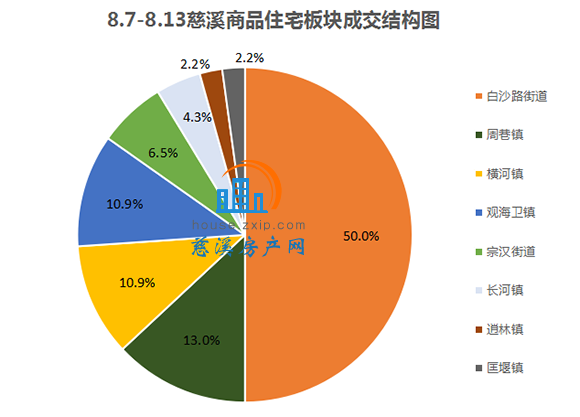 慈溪商品住宅(含别墅)各版块成交情况中,城区版块(浒山街道、古塘街道、白沙路街道、宗汉街道、坎墩街道)共成交26套,成交均价10768.64元/㎡。排名前三版块:白沙路街道备案23套,占上周商品住宅成交总量的50%;周巷镇备案6套,占上周商品住宅成交总量的13%;横河镇与观海卫镇各备案5套,分别占上周商品住宅成交总量的10.9%。