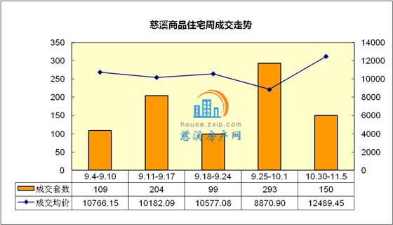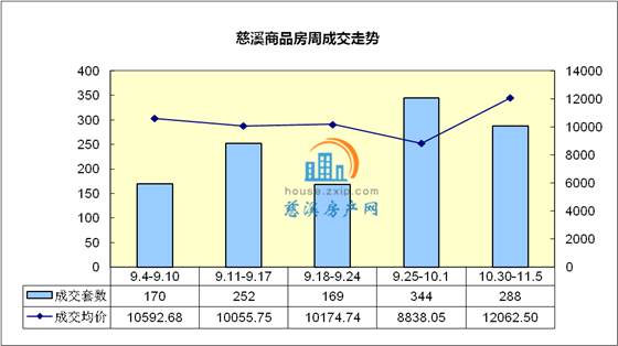 上周(10.30-11.5)成交各类房源(含住宅、公寓、商铺、写字楼和车库)共计288套,成交均价12062.50元/㎡,成交面积27851方。