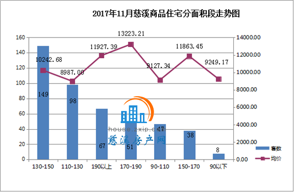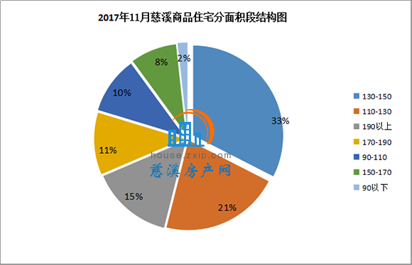 11月慈溪商品住宅按面积段成交中,130㎡-150㎡以上面积段产品成交149套,占总成交套数的33%,销量排名第一;110㎡-130㎡面积段产品成交98套,占总成交套数的21%,销量排名第二;与以往几个月不同的是,11月慈溪商品住宅成交中大面积改善性住房需求增加明显。190㎡以上面积段产品成交67套,占总成交套数的15%,销量排名第三。