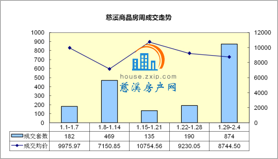 上周(1.29-2.4)成交各类房源(含住宅、公寓、商铺、写字楼和车库)共计874套,成交均价8744.50元/㎡,成交面积32441方。环比上上周成交量上涨360%,成交均价下跌5.26%。