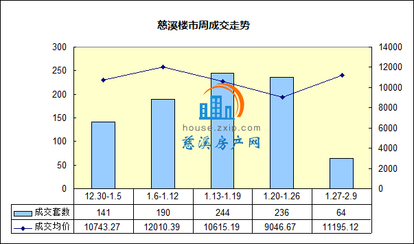 慈溪上两周(1.27-2.9)成交各类房源(含住宅、公寓、商铺、写字楼和车库)共计64套,成交均价11195.12元/㎡。期间横跨春节长假,因而成交备案并不多。