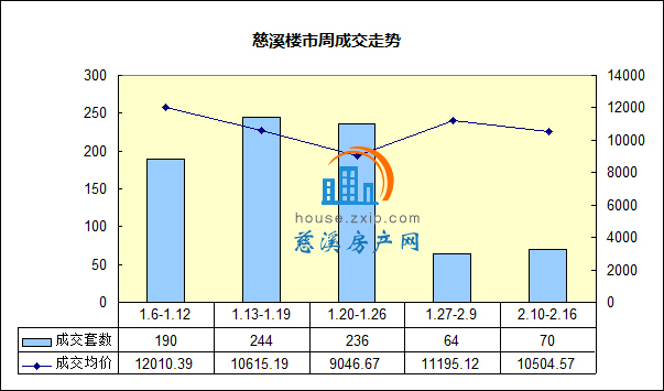 慈溪上周(2.10-2.16)成交各类房源(含住宅、公寓、商铺、写字楼和车库)共计70套,成交均价10504.57元/㎡。