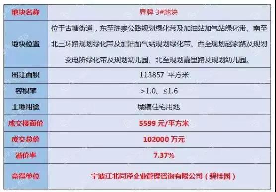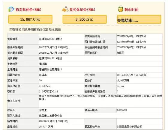 第三块值得一提的是慈横河I201701#地块,该地块位于横河镇,东至规划绿化带、南至东上河村宅基地及道路、西至规划翠屏路、北至横彭公路。总出让面积为37719㎡(约56.579亩),经过236轮激烈竞价,最终 由上海贺吉置业有限公司(上坤置业),以楼面价2727.22元/㎡,总成交金额25717万元竞得。