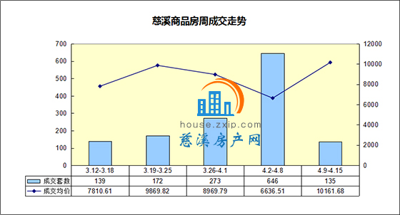 上周(4.9-4.15)成交各类房源(含住宅、公寓、商铺、写字楼和车库)共计135套,成交均价10161.68元/㎡,成交面积13824.26方。环比上上周成交量下跌79.10%,成交均价上涨53.12%。