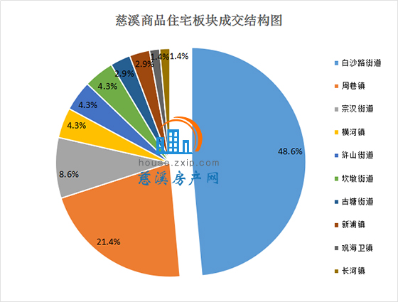 慈溪商品住宅(含别墅)各版块成交情况中,城区版块(浒山街道、古塘街道、白沙路街道、宗汉街道、坎墩街道)共成交48套,成交均价12504.04元/㎡。排名前三版块:白沙路街道备案34套,占上周商品住宅成交总量的48.6%;周巷镇备案15套,占上周商品住宅成交总量的21.4%;宗汉街道备案6套,占上周商品住宅成交总量的8.6%。