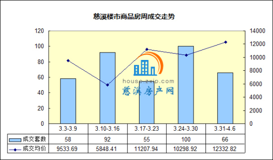 慈溪上周(3.31-4.6)成交各类房源(含住宅、公寓、商铺、写字楼和车库)共计66套,成交面积为6500方,成交均价12332.82元/㎡。环比上上周成交数量下跌34%,成交均价上涨19.75%。成交排名前三位中,梵石双囍花园备案23套,宝诚星海湾与嘉润国际广场各备案6套。