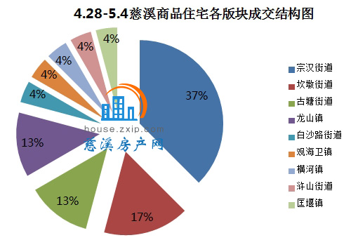 慈溪商品住宅各版块成交情况中,宗汉街道备案9套,占37%;坎墩街道4套,占17%;古塘街道与龙山镇各成交备案3套,各占13%。