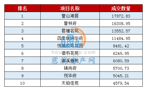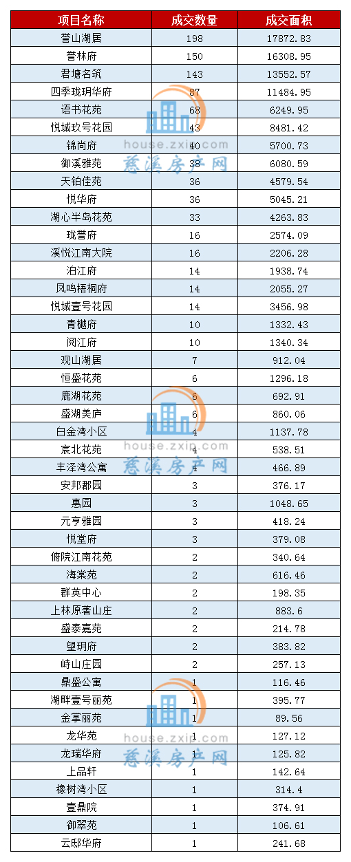 从成交排行榜上看,位于观海卫镇的誉山湖居以198套的成交量夺得11月份慈溪商品住宅交易套数排行的冠军宝座,领跑慈溪楼市,而古塘街道的誉林府以150套的成交量居于亚军位置。紧接着是坎墩街道的君塘名筑,以143套住宅成交量跻身前三甲。