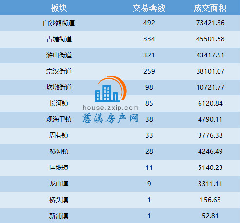 在乡镇板块中长河镇和观海卫镇成交量遥遥领先。白沙路街道以月成交492套居于榜首,其次是古塘街道以334套的成交量位居第二,浒山街道与宗汉街道以321套与259套的数据紧随其后。