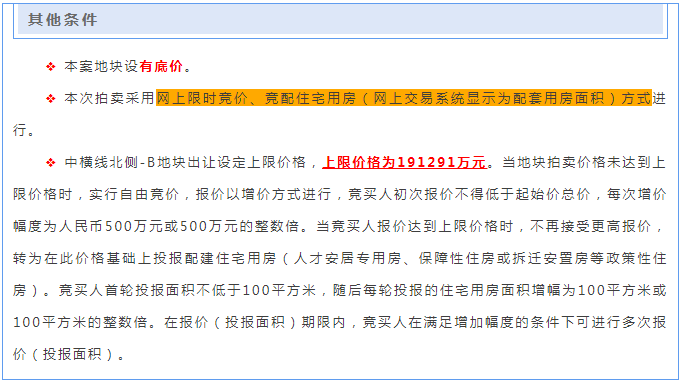 出让面积95338m2(折合143.007亩),1.0<容积率≤2.2,建筑密度≤45%,绿地率≥35%,限高36-80m。拍卖起始总价127791万元,竞买保证金25560万元,土地用途为城镇住宅用地(普通商品房) /城镇住宅及配套用地、商服用地。