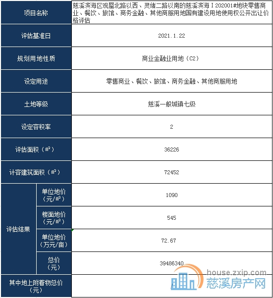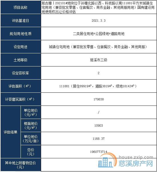 此外,我们也注意到慈古塘Ⅰ202101#地块有过两个评估基准日,在1月22日评估的起始楼面价为6541元/㎡,700.9万/亩,起始总价约11.76亿(详情:多宗优质土地结果公示2021.01.27),而在上述3月3日评估的起始楼面价为10903元/㎡,1168.37万/亩,起始总价约19.61亿。也就是短短的2个月不到,同一个地块评估中,起始楼面价相差4362元/㎡,起始总价相差近8个亿,足可见近期慈溪土拍的火爆。
