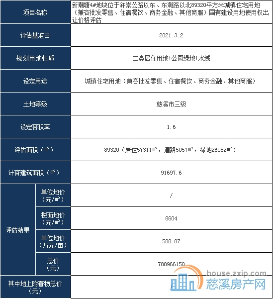 2021年3月9日,慈溪市自然资源规划局公示慈溪滨海Ⅰ202001#地块、新潮塘4#地块、慈古塘Ⅰ202101#地块等几宗地块评估价格,具体信息如下: