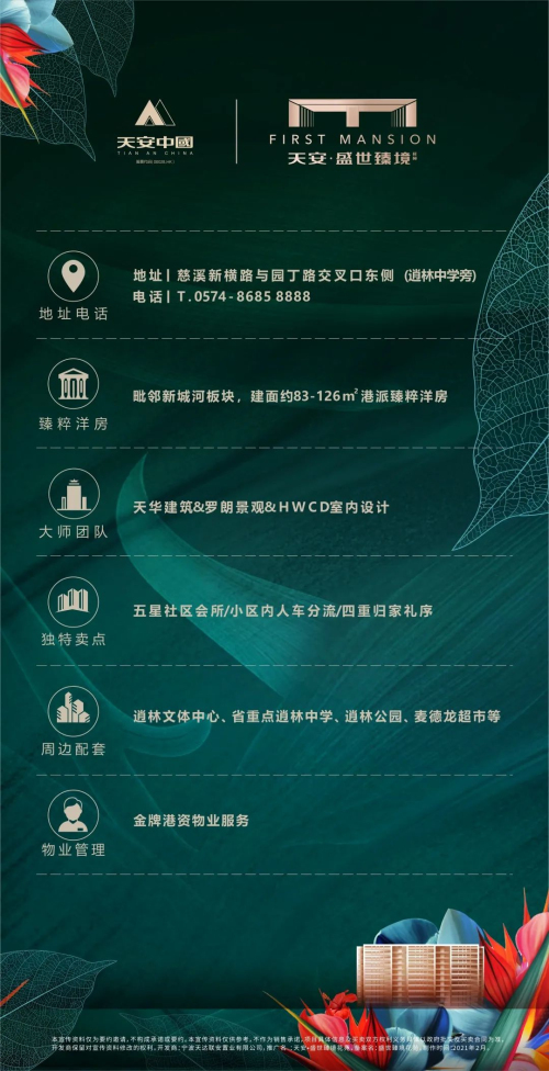 作为港资豪宅缔造者,天安中国始终秉持着强烈的社会责任感,不断追求社区的品质,以及对业主的贴心服务。盛世臻境作为天安在慈溪的首个作品,携手国际一流大师团队,倾力打造高品质作品,礼献全城!以初心精筑人居理想,以匠心成就宜居范本,为共建美好慈溪贡献力量。