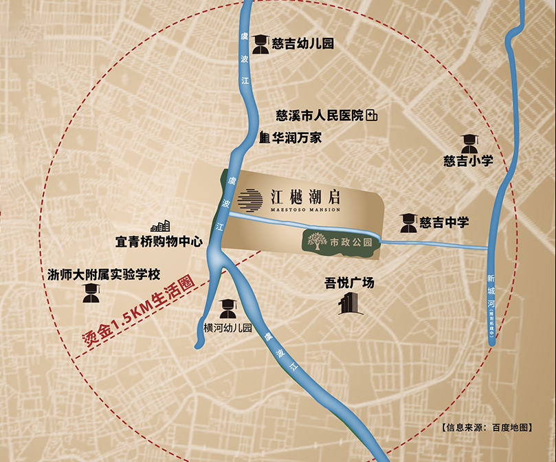 项目周边紧邻的有慈吉小学、慈吉中学,项目所在板块去年也迎来了一位大咖加盟,正是投资约3.37亿的全慈溪第一所九年一贯制学校——浙师大附属学校(已于去年9月开学),新校区与项目的直线距离不到1公里。周边人文气息重、学习氛围良好,让孩子从小在浓郁的书香环绕下,健康快乐成长。