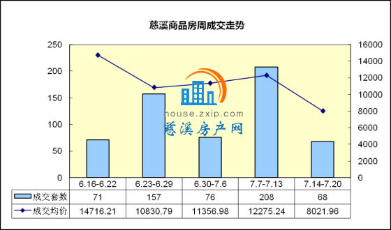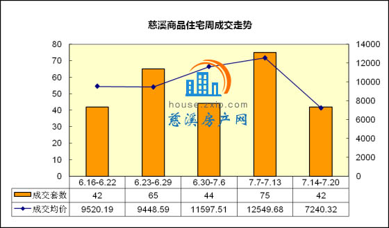 慈溪上周(7.14-7.20)成交各类房源(含住宅、公寓、商铺、写字楼和车库)共计68套,成交均价8021.96元/㎡,成交面积为6167方。环比上上周成交量下跌67.31%,成交均价下跌34.65%,成交面积下跌64.14%。
