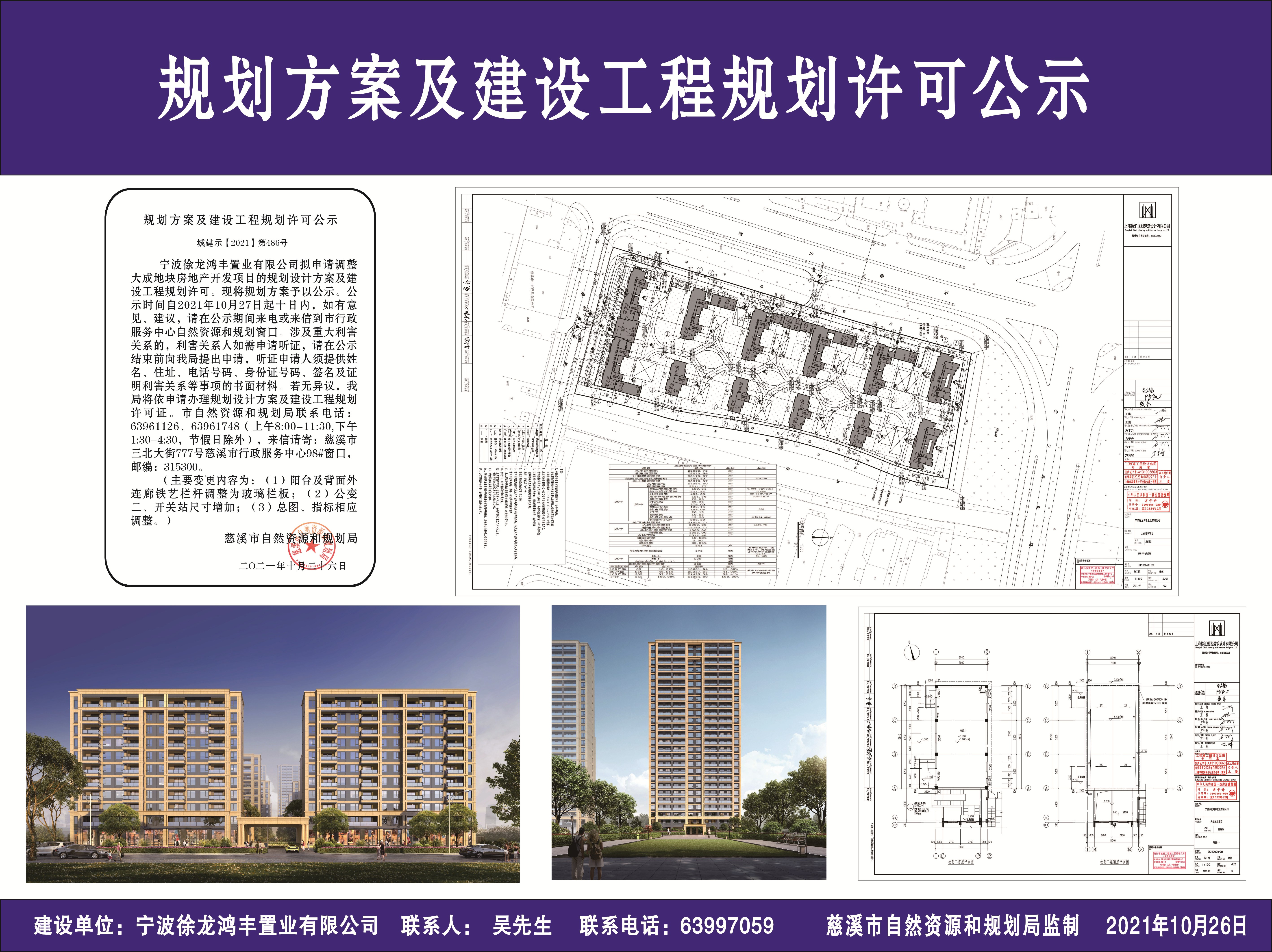 宁波徐龙鸿丰置业有限公司拟申请调整大成地块房地产开发项目的规划设计方案及建设工程规划许可。现将规划方案予以公示。公示时间自2021年10月27日起十日内,如有意见、建议,请在公示期间来电或来信到市行政服务中心自然资源和规划窗口。涉及重大利害关系的,利害关系人如需申请听证,请在公示结束前向我局提出申请,听证申请人须提供姓名、住址、电话号码、身份证号码、签名及证明利害关系等事项的书面材料。若无异议,我局将依申请办理规划设计方案及建设工程规划许可证。市自然资源和规划局联系电话:63961126、63961748(上午8:00-11:30,下午1:30-4:30,节假日除外),来信请寄:慈溪市三北大街777号慈溪市行政服务中心98#窗口,邮编:315300。