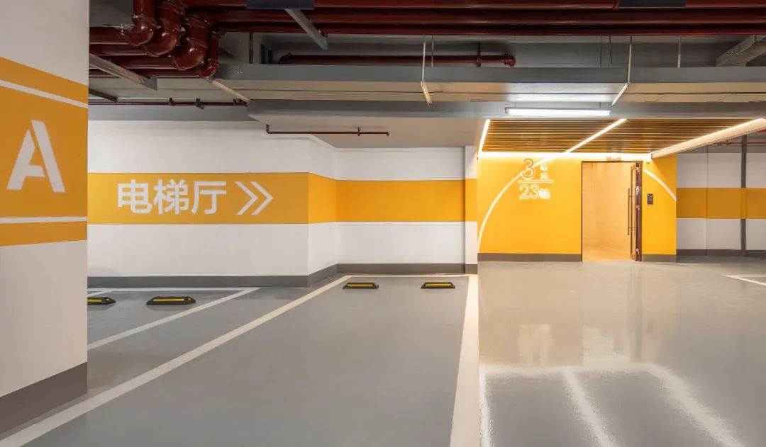微笑式地下车库,地面是潮流的光面环氧地坪,专属通道加上金属格栅吊顶增强归家仪式感,墙面上增设CIFI7微笑曲线元素,简洁而大气,从各个细节都感受到旭辉式的温暖。