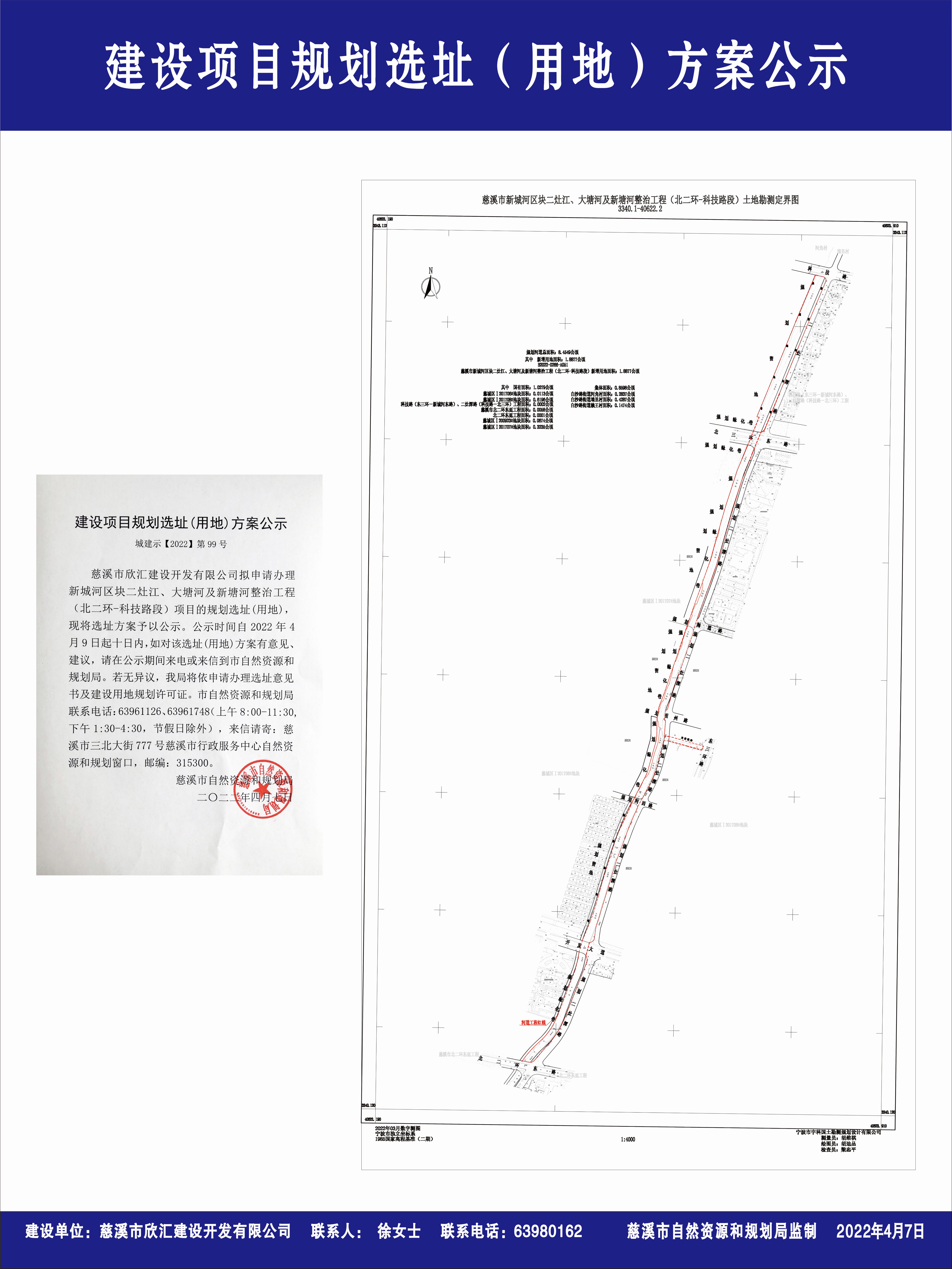 慈溪市欣汇建设开发有限公司拟申请办理新城河区块二灶江、大塘河及新塘河整治工程(北二环-科技路段)项目的规划选址(用地),现将选址方案予以公示。公示时间自2022年4月9日起十日内,如对该选址(用地)方案有意见、建议,请在公示期间来电或来信到市自然资源和规划局。若无异议,我局将依申请办理选址意见书及建设用地规划许可证。市自然资源和规划局联系电话:63961126、63961748(上午8:00-11:30,下午1:30-4:30,节假日除外),来信请寄:慈溪市三北大街777号慈溪市行政服务中心自然资源和规划窗口,邮编:315300。