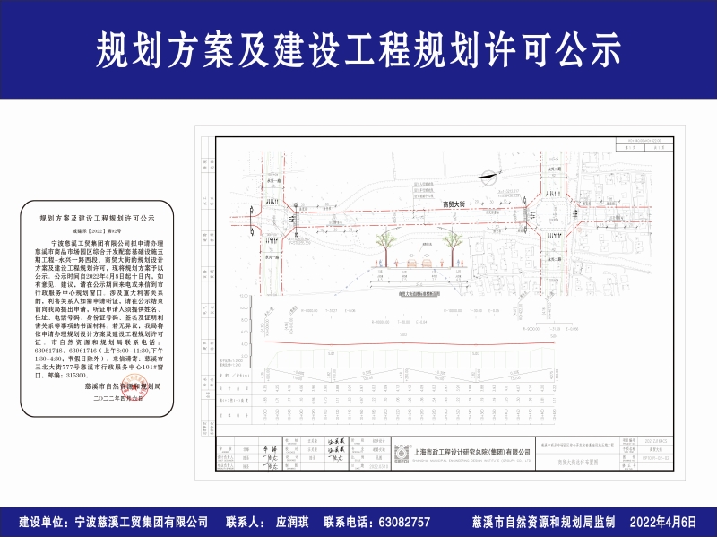 宁波慈溪工贸集团有限公司拟申请办理慈溪市商品市场园区综合开发配套基础设施五期工程-永兴一路西段、商贸大街的规划设计方案及建设工程规划许可,现将规划方案予以公示。公示时间自2022年4月8日起十日内,如有意见、建议,请在公示期间来电或来信到市行政服务中心规划窗口。涉及重大利害关系的,利害关系人如需申请听证,请在公示结束前向我局提出申请,听证申请人须提供姓名、住址、电话号码、身份证号码、签名及证明利害关系等事项的书面材料。若无异议,我局将依申请办理规划设计方案及建设工程规划许可证。市自然资源和规划局联系电话:63961748、63961746(上午8:00-11:30,下午1:30-4:30,节假日除外),来信请寄:慈溪市三北大街777号慈溪市行政服务中心101#窗口,邮编:315300。