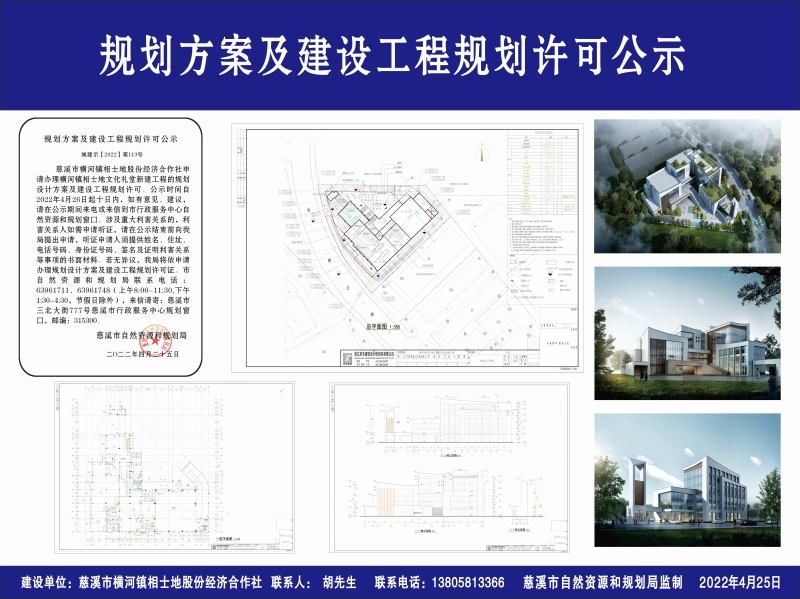 慈溪市横河镇相士地股份经济合作社申请办理横河镇相士地文化礼堂新建工程的规划设计方案及建设工程规划许可。公示时间自2022年4月26日起十日内,如有意见、建议,请在公示期间来电或来信到市行政服务中心自然资源和规划窗口。涉及重大利害关系的,利害关系人如需申请听证,请在公示结束前向我局提出申请,听证申请人须提供姓名、住址、电话号码、身份证号码、签名及证明利害关系等事项的书面材料。若无异议,我局将依申请办理规划设计方案及建设工程规划许可证。市自然资源和规划局联系电话:63961711、63961748(上午8:00-11:30,下午1:30-4:30,节假日除外),来信请寄:慈溪市三北大街777号慈溪市行政服务中心规划窗口,邮编:315300。