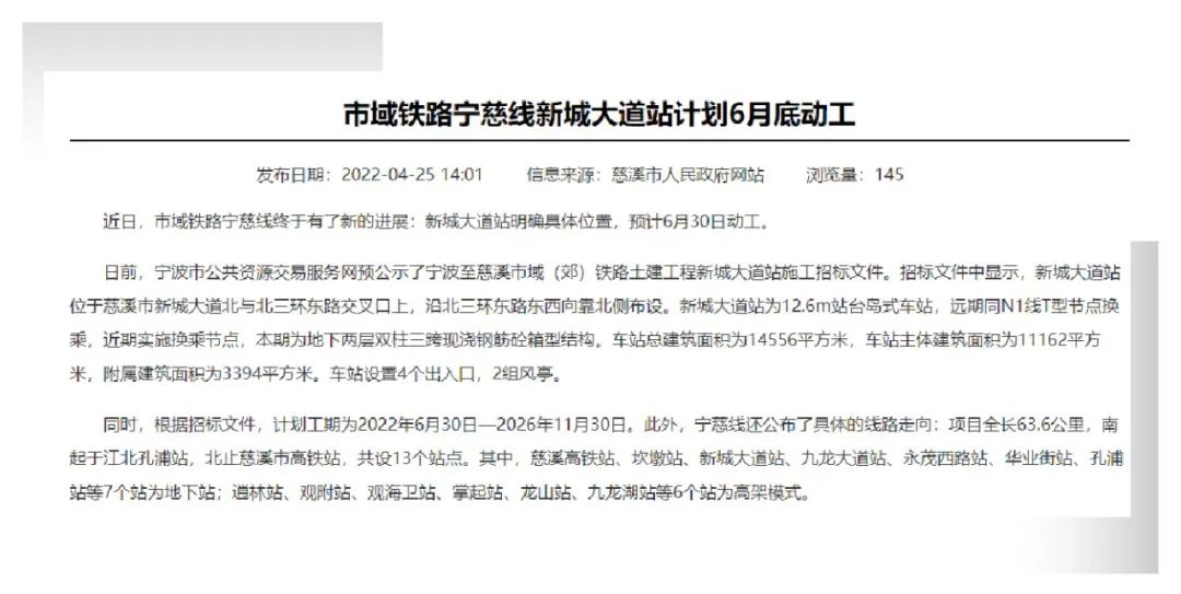 近日宁慈线新城大道站明确具体位置,