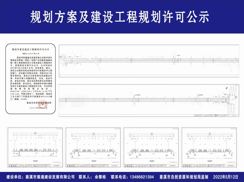 慈溪市慈通建设发展有限公司拟申请办理慈溪市慈通(掌起)创新产业区配套基础设施一期工程的规划设计方案及建设工程规划许可,现将规划方案予以公示。公示时间自2022年5月14日起十日内,如有意见、建议,请在公示期间来电或来信到市行政服务中心规划窗口。涉及重大利害关系的,利害关系人如需申请听证,请在公示结束前向我局提出申请,听证申请人须提供姓名、住址、电话号码、身份证号码、签名及证明利害关系等事项的书面材料。若无异议,我局将依申请办理规划设计方案及建设工程规划许可证。市自然资源和规划局联系电话:63961748、63961746(上午8:00-11:30,下午1:30-4:30,节假日除外),来信请寄:慈溪市三北大街777号慈溪市行政服务中心101#窗口,邮编:315300。