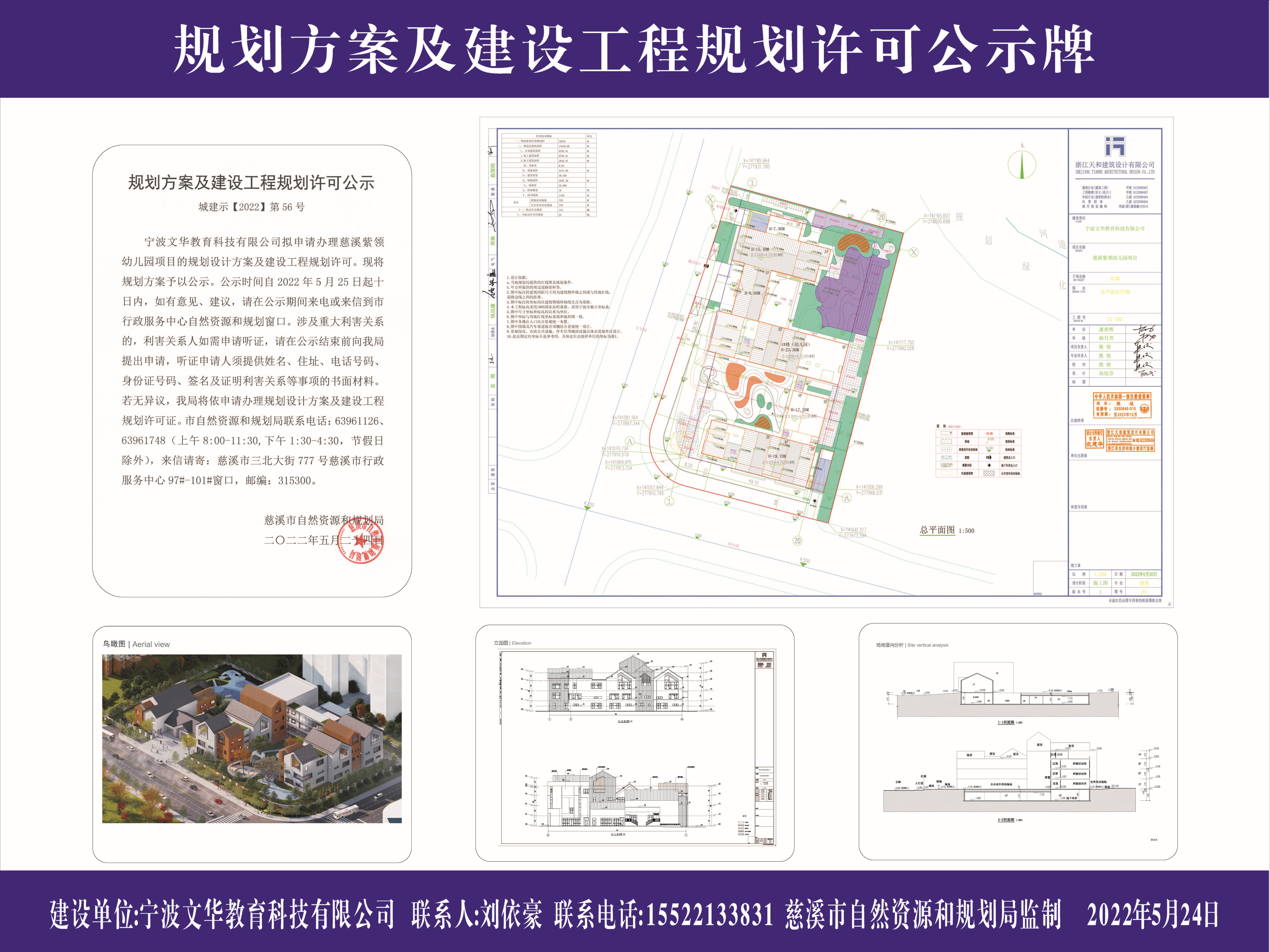 宁波文华教育科技有限公司拟申请办理慈溪紫领幼儿园项目的规划设计方案及建设工程规划许可。现将规划方案予以公示。公示时间自2022年5月25日起十日内,如有意见、建议,请在公示期间来电或来信到市行政服务中心自然资源和规划窗口。涉及重大利害关系的,利害关系人如需申请听证,请在公示结束前向我局提出申请,听证申请人须提供姓名、住址、电话号码、身份证号码、签名及证明利害关系等事项的书面材料。若无异议,我局将依申请办理规划设计方案及建设工程规划许可证。市自然资源和规划局联系电话:63961126、63961748(上午8:00-11:30,下午1:30-4:30,节假日除外),来信请寄:慈溪市三北大街777号慈溪市行政服务中心97#-101#窗口,邮编:315300。